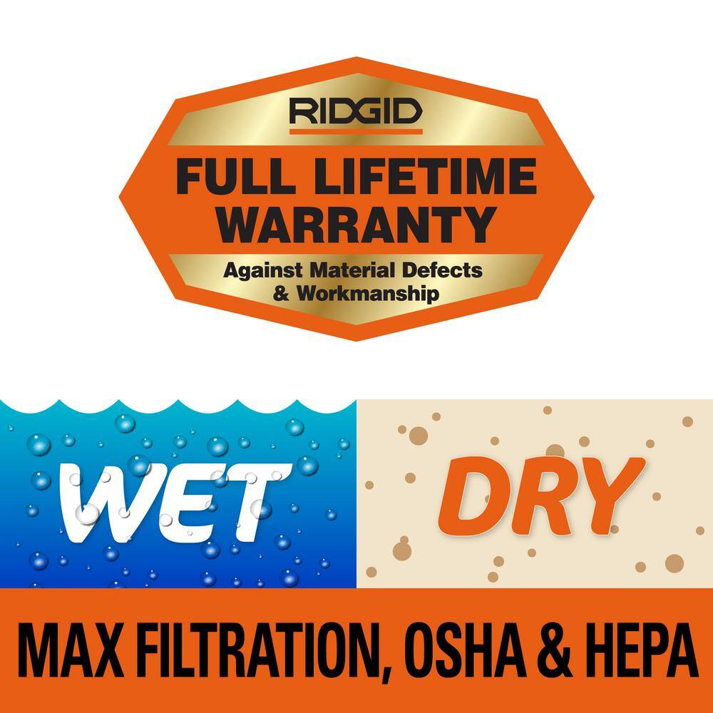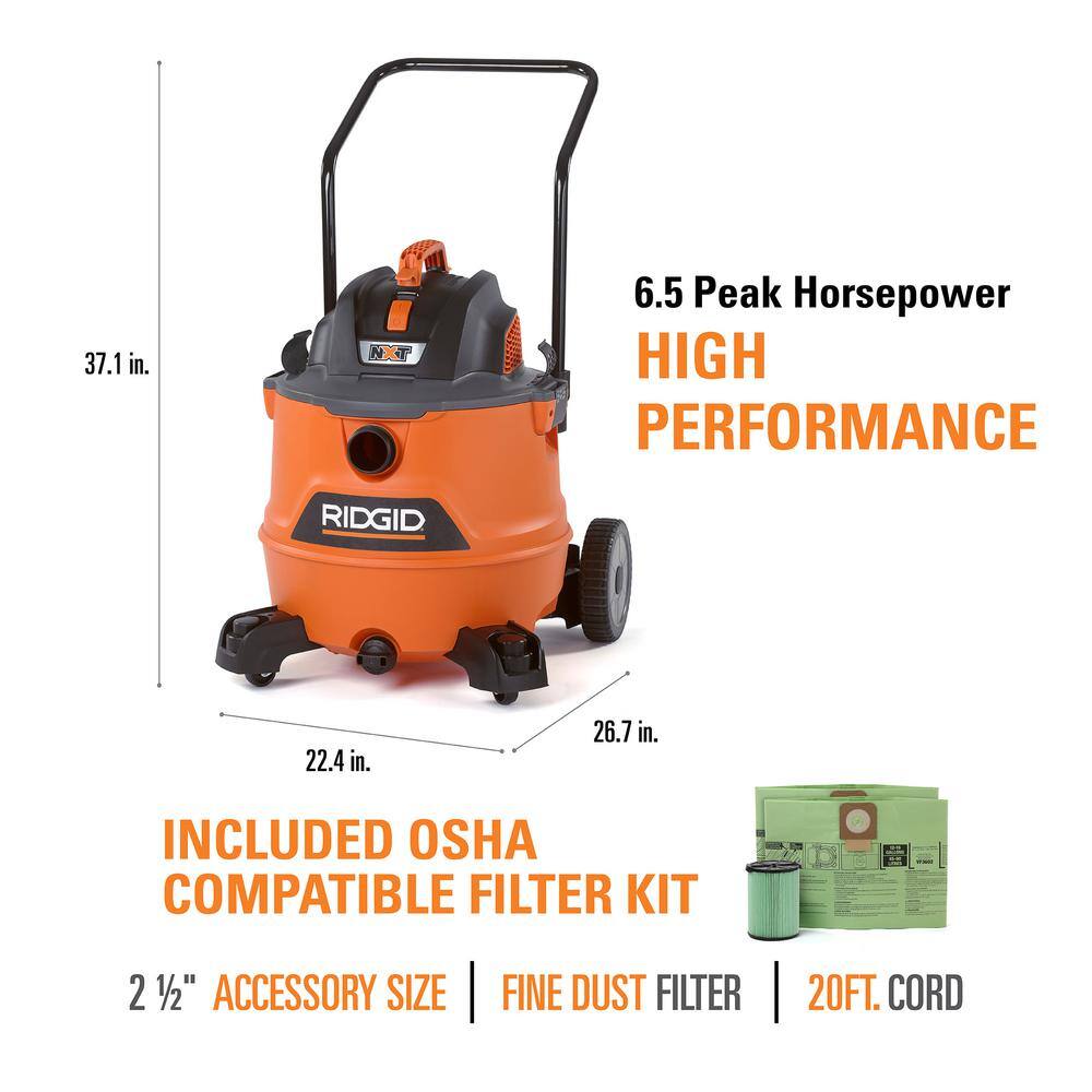 RIDGID HD1800A 16 Gallon 6.5 Peak HP NXT Wet/Dry Shop Vacuum. Fine Dust Filter. Locking Hose. Accessories. OSHA and HEPA Filtration Kit