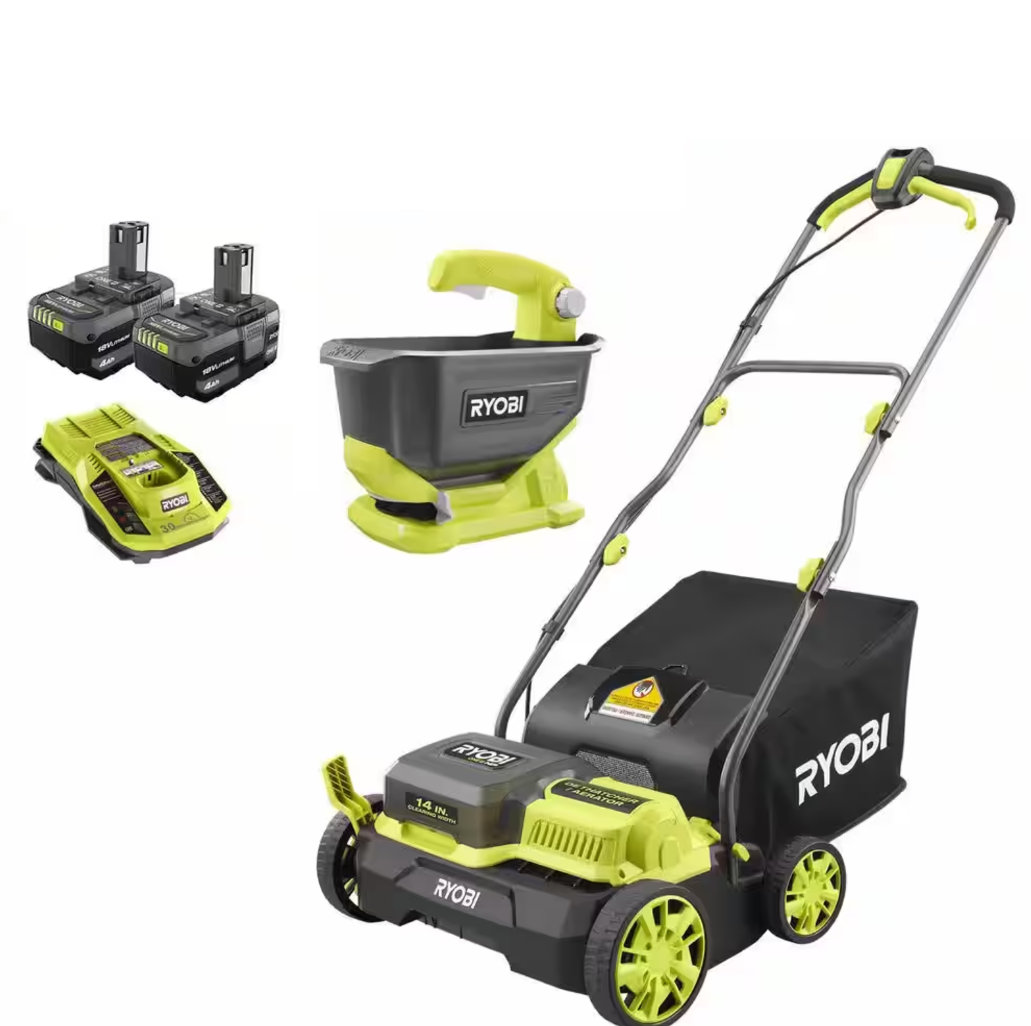 RYOBI P2740-SS ONE+ HP 18-Volt Brushless 14 in. Cordless Battery Cultivator. Seed Spreader. Two 4.0 Ah Batteries and Charger