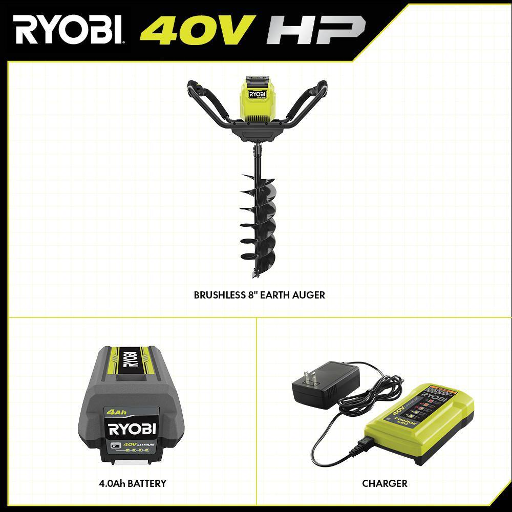 RYOBI RY40710VNM 40V HP Brushless Cordless Earth Auger with 8 in. Bit with 4.0 Ah Battery and Charger