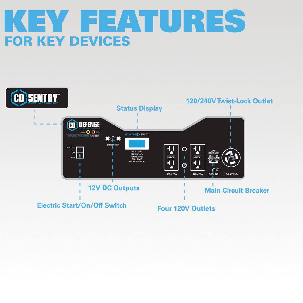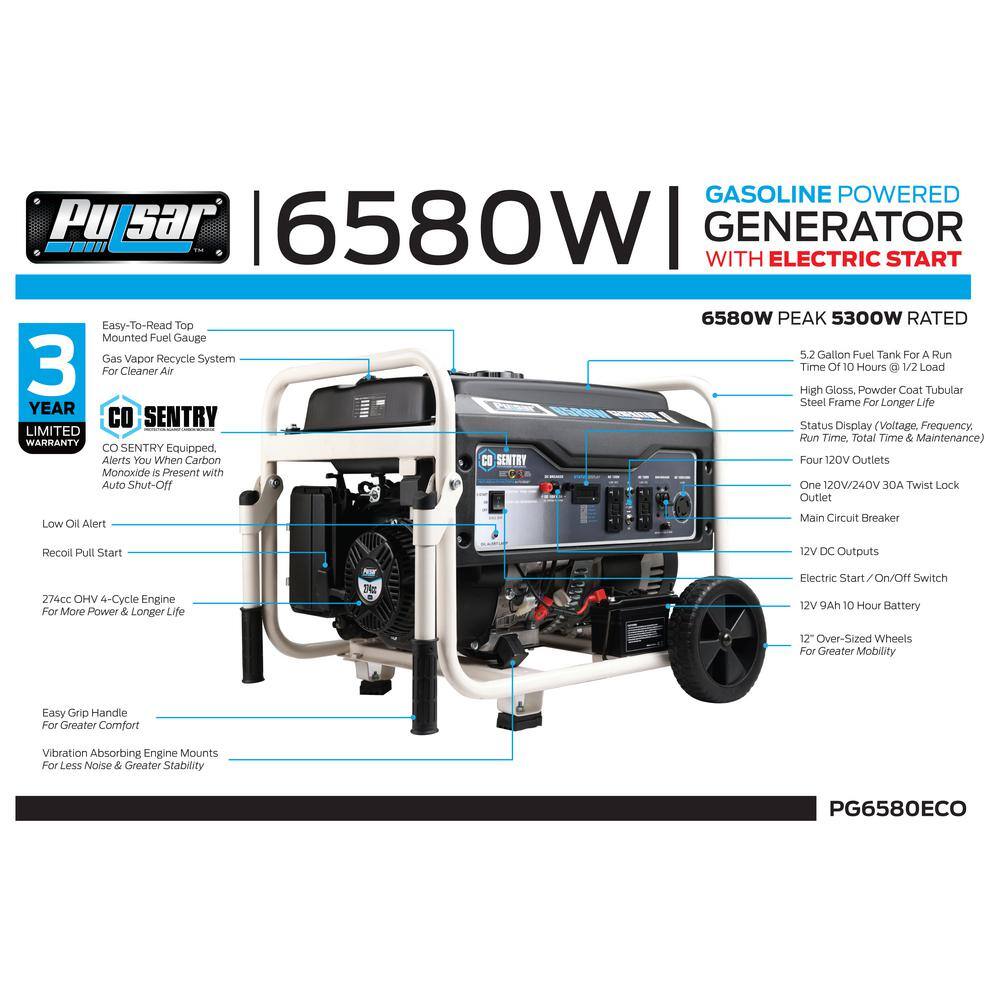 Pulsar PG6580ECO 6.580/5.300-Watt Electric Start Gasoline Portable Home Power Generator with CO Alert