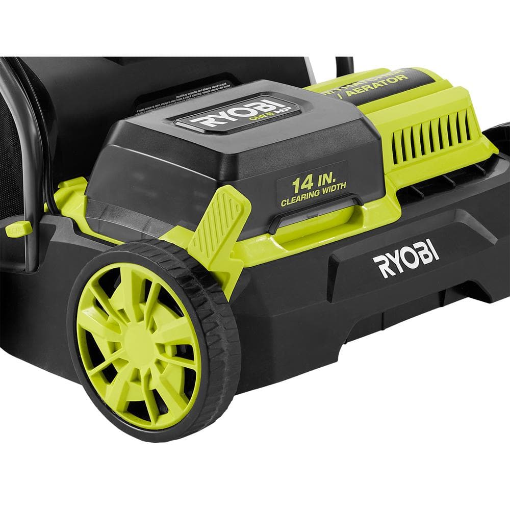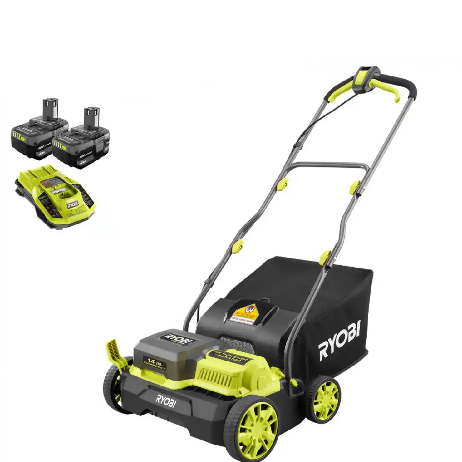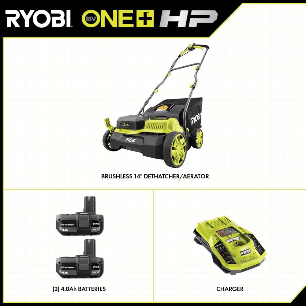 RYOBI P2740 ONE+ HP 18V Brushless 14 in. Cordless Battery Dethatcher/Aerator with (2) 4.0 Ah Batteries and Charger