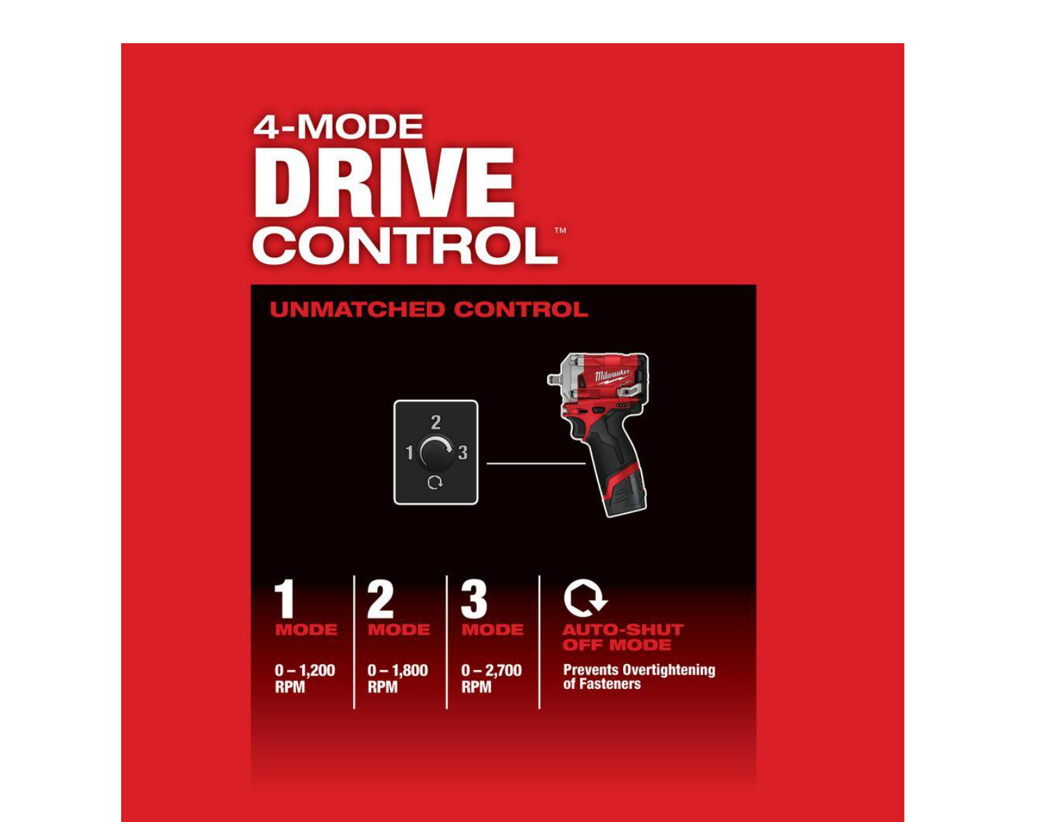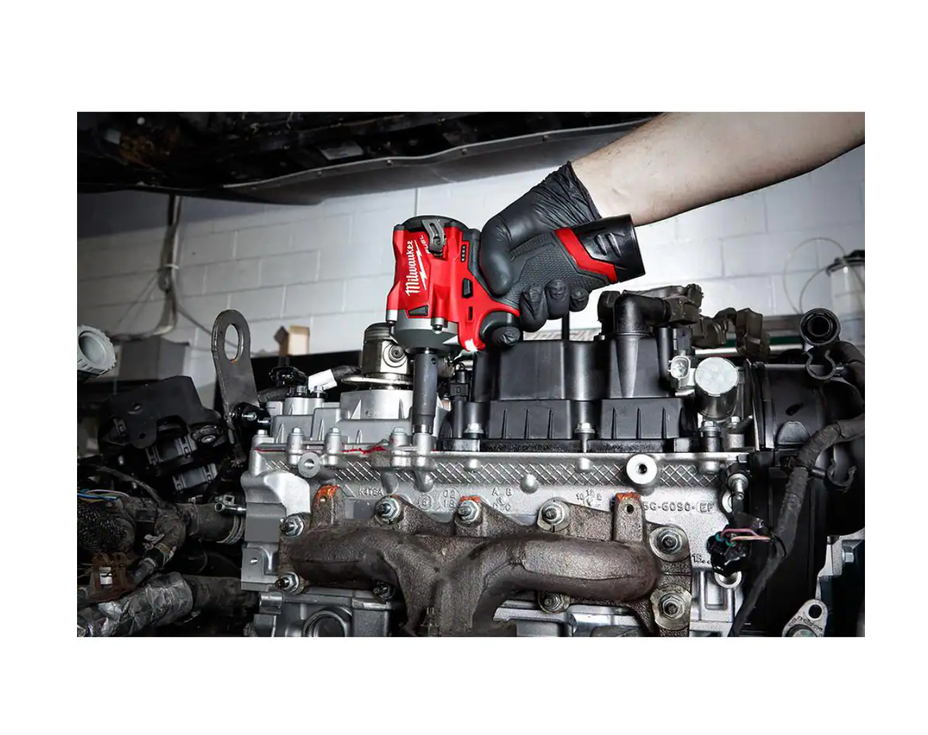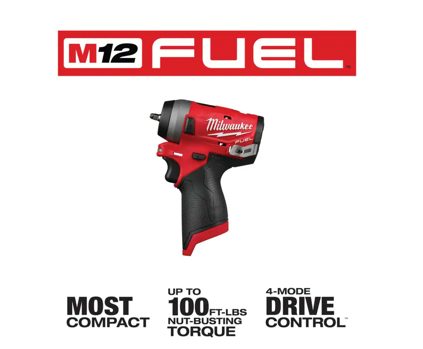 Milwaukee 2554-20-2555-20-48-11-2412 M12 FUEL 12V Lithium-Ion Brushless Cordless Stubby 3/8 in. and 1/2 in. Impact Wrenches with two 3.0 Ah Batteries
