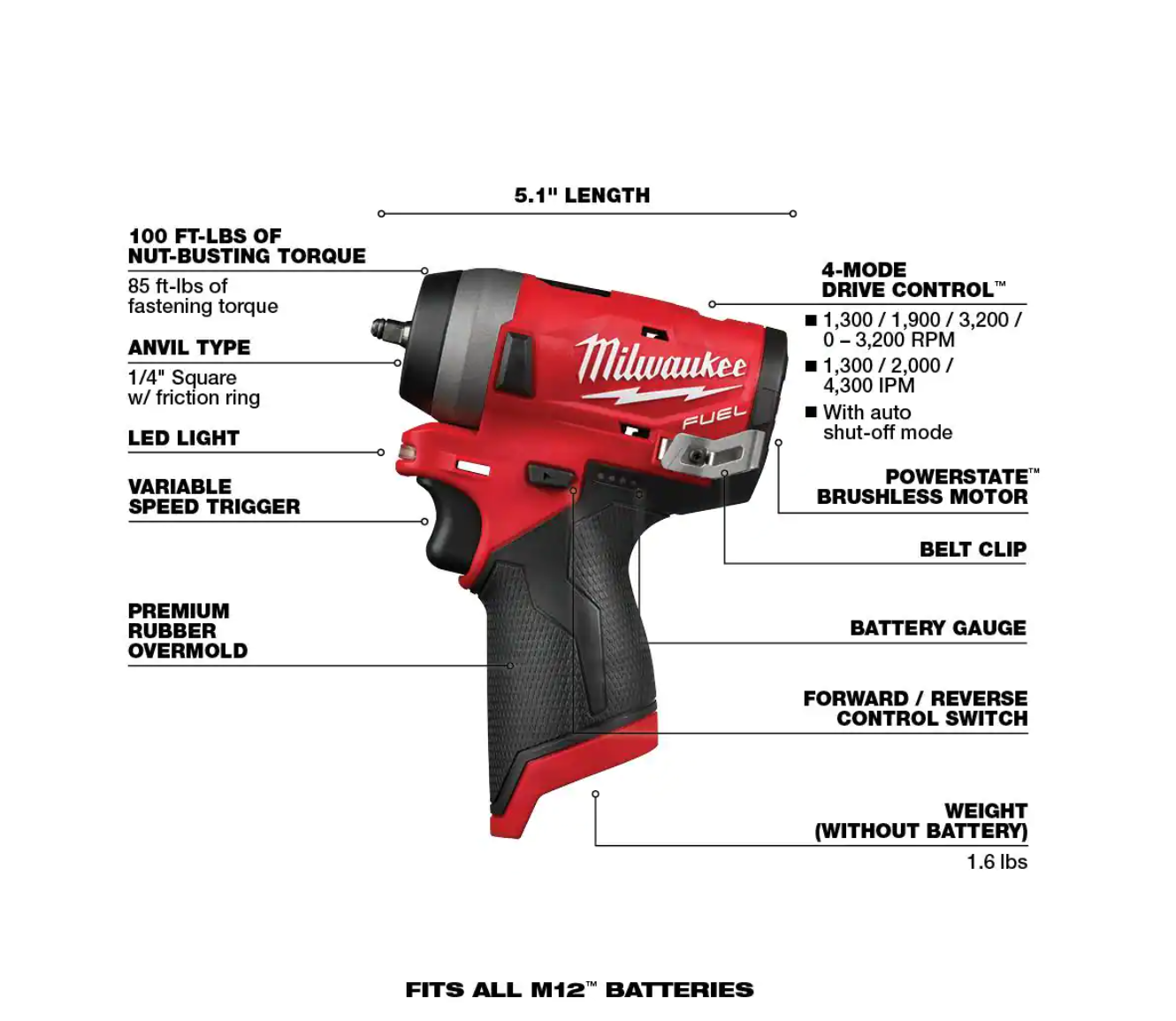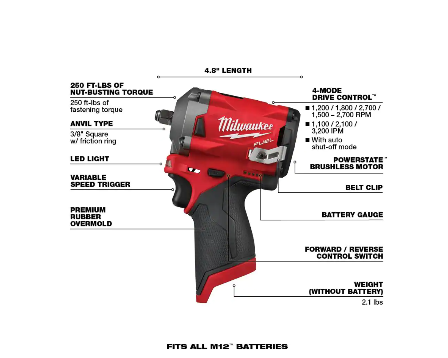 Milwaukee 2554-22-2446-20 M12 FUEL 12V Lithium-Ion Cordless Stubby 3/8 in. Impact Wrench Kit with Grease Gun. One 4.0 and One 2.0Ah Battery