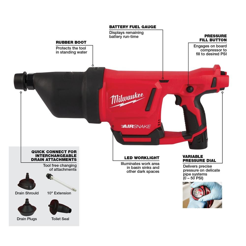 Milwaukee 2572B-21-2426-20 M12 12V Lithium-Ion Cordless Drain Cleaning Airsnake Air Gun Kit with M12 Multi-Tool