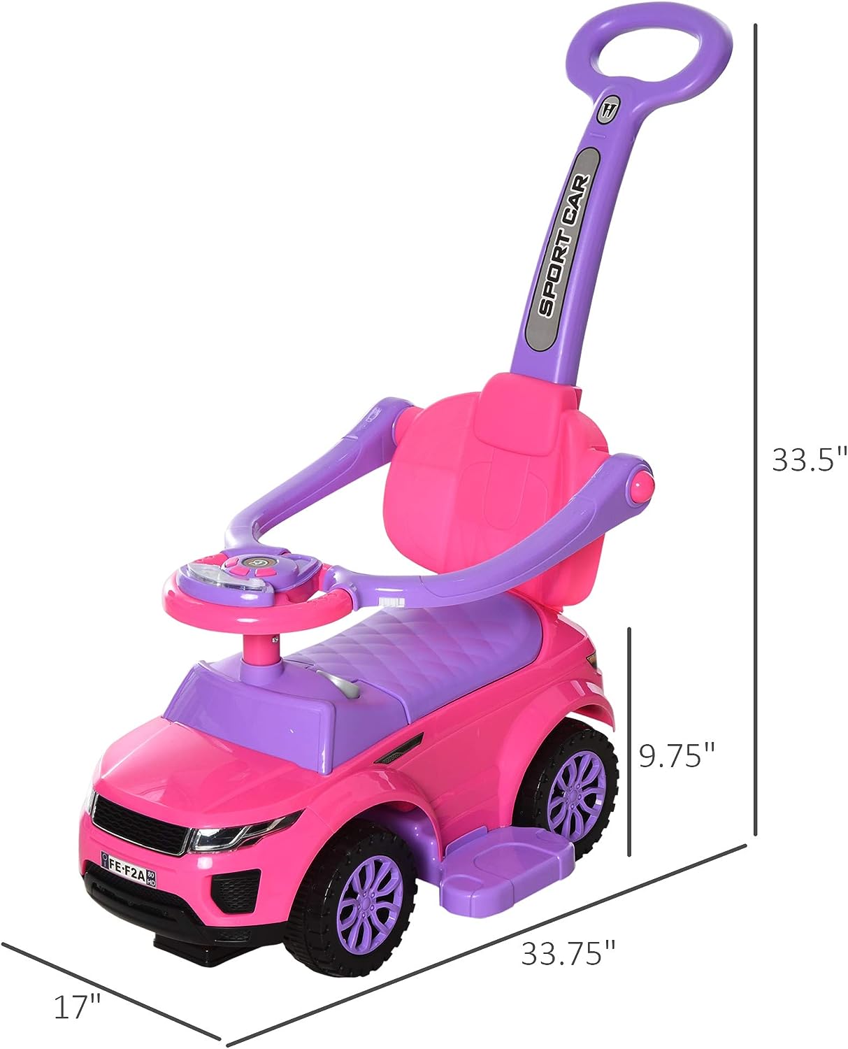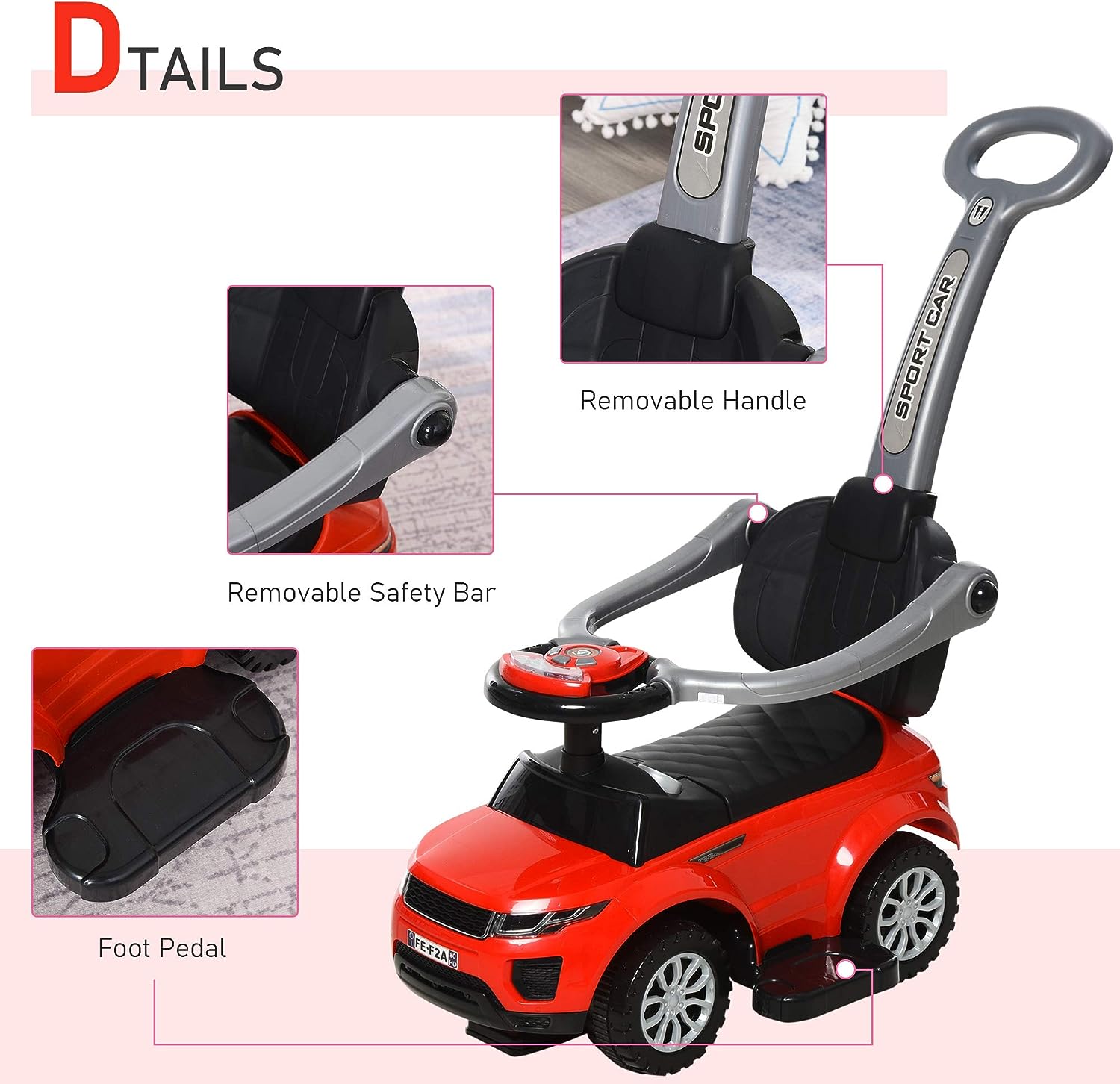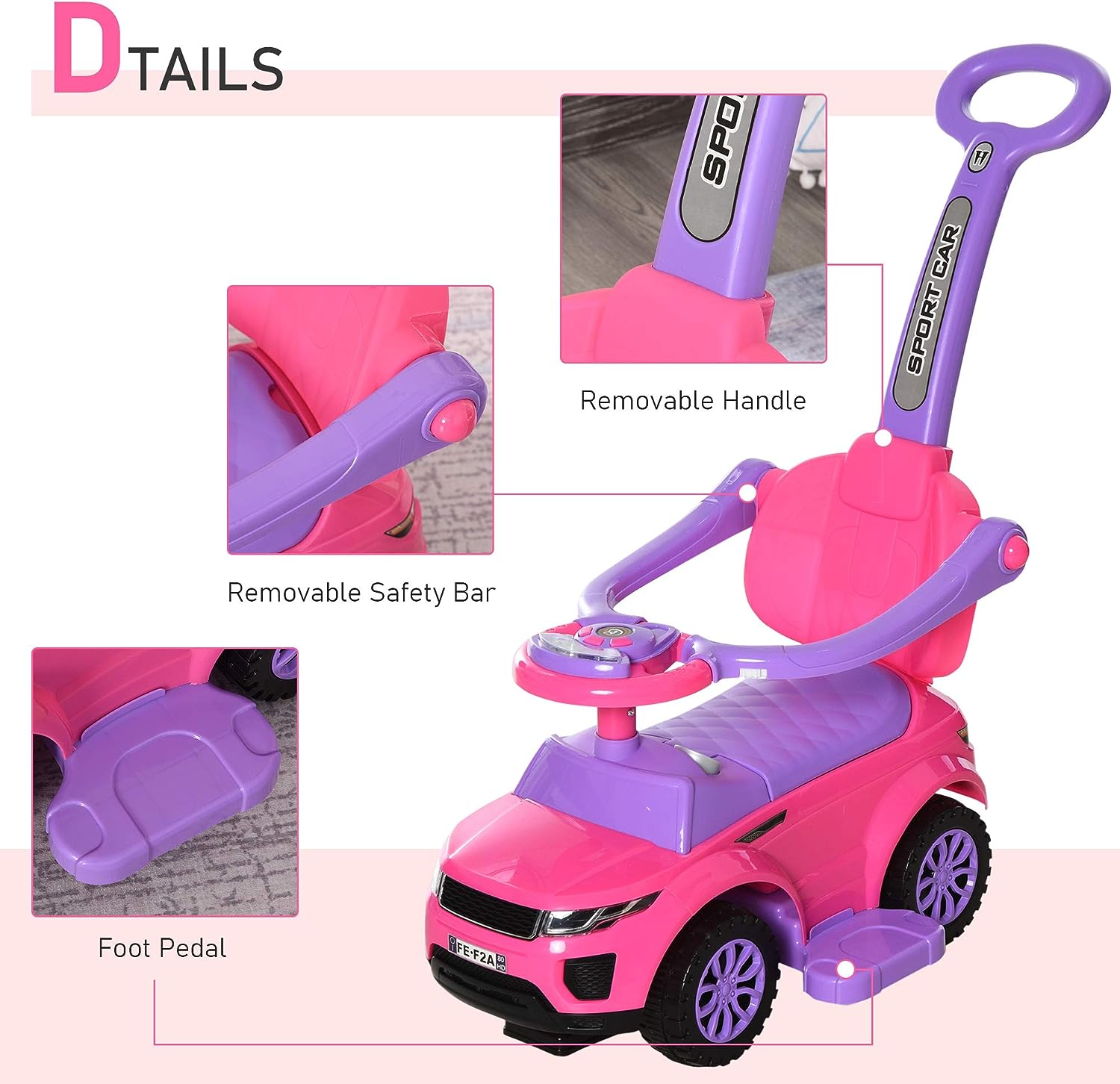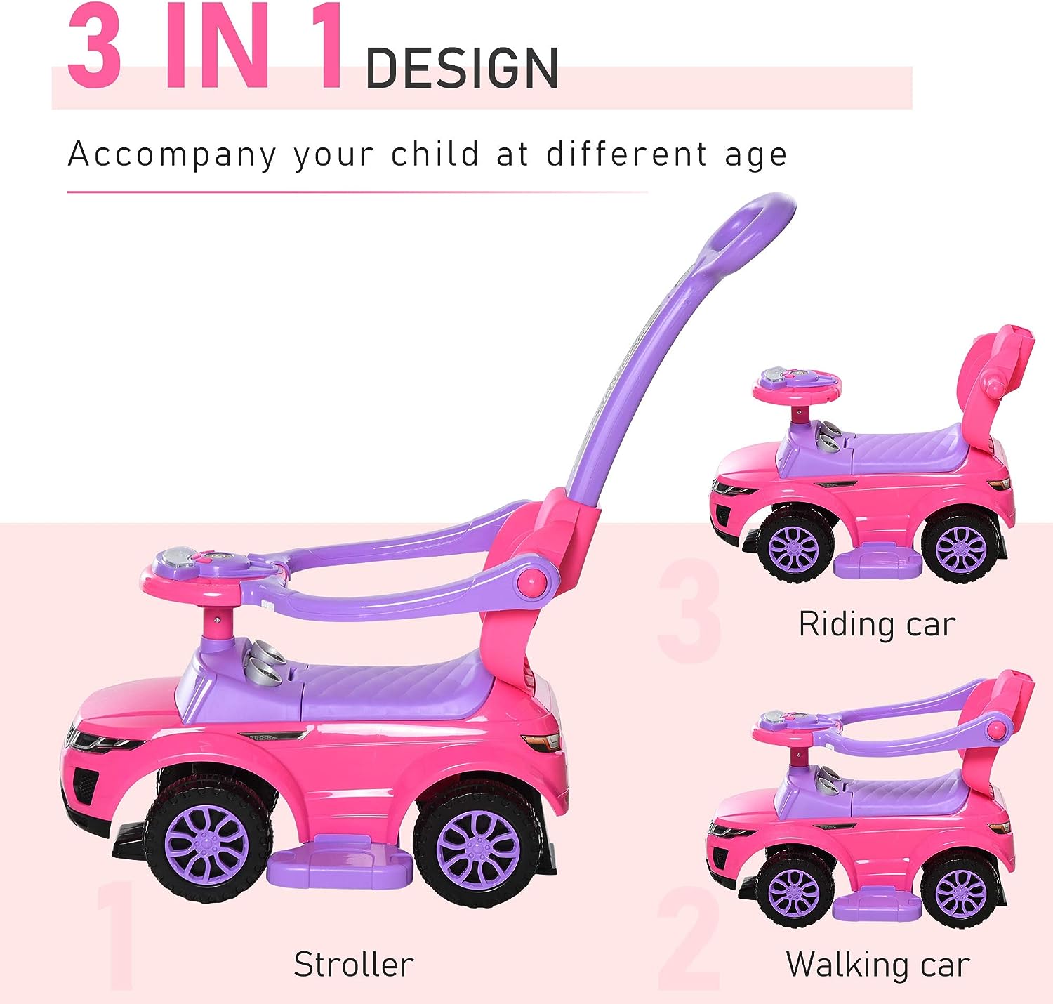 Aosom 3 in 1 Push Cars for Toddlers Kid Ride on Push Car Stroller Sliding Walking Car with Horn Music Light Function Secure Bar Ride on Toy for Boy Girl 1-3 Years Old Pink
