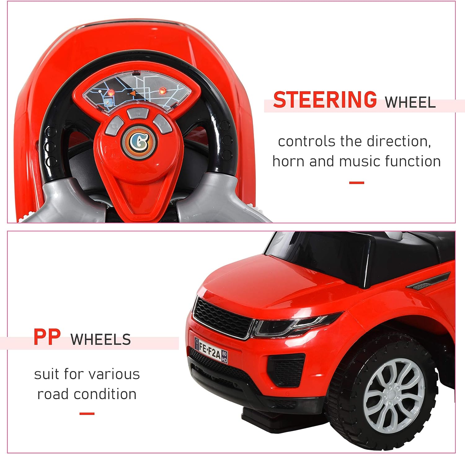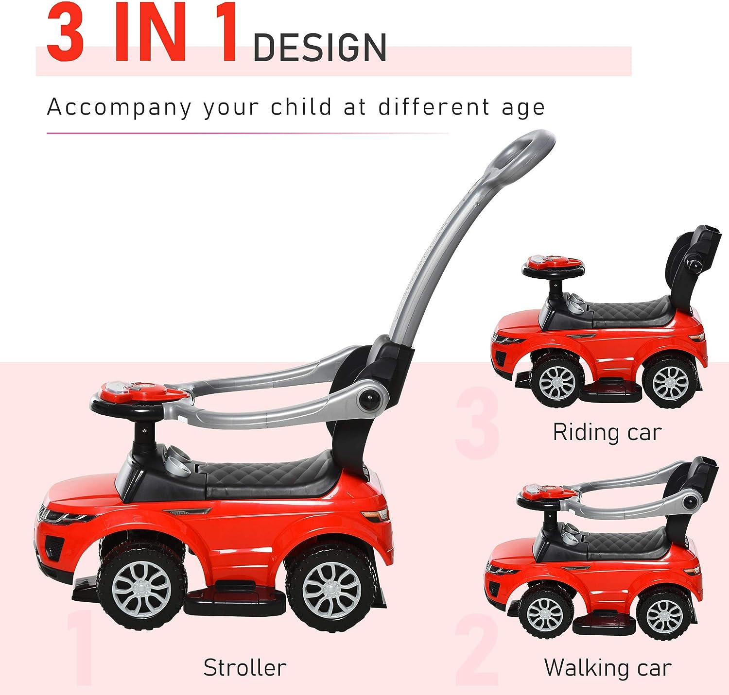 Aosom 3 in 1 Push Cars for Toddlers Kid Ride on Push Car Stroller Sliding Walking Car with Horn Music Light Function Secure Bar Ride on Toy for Boy Girl 1-3 Years Old Red