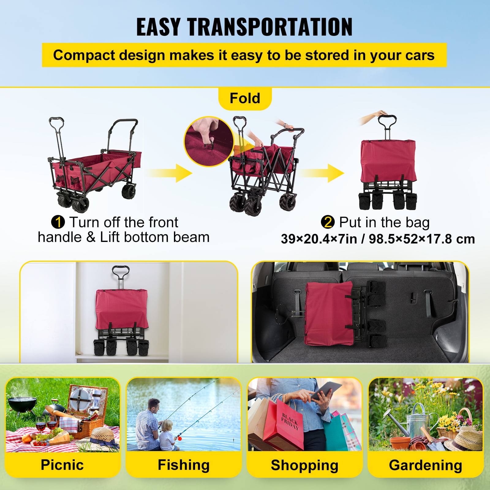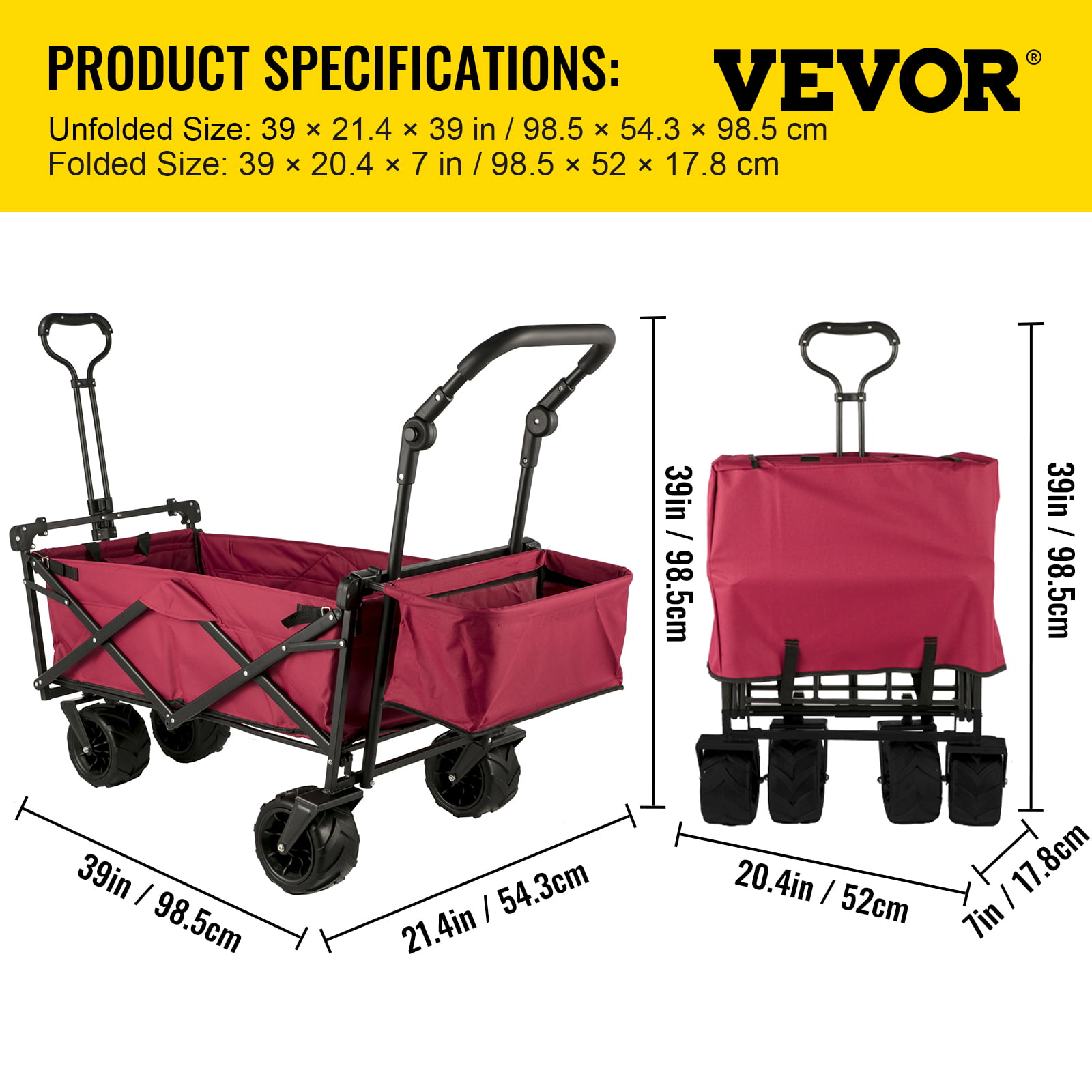 VEVORbrand Collapsible Wagon Cart Red. Foldable Wagon Cart Removable Canopy 601D Oxford Cloth. Collapsible Wagon Oversized Wheels. Portable Folding Wagon Adjustable Handles. Beach. Garden. Sports