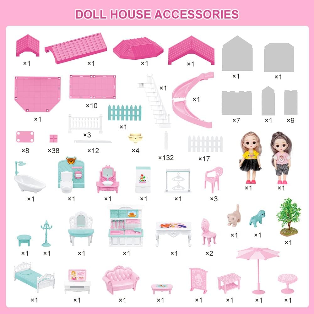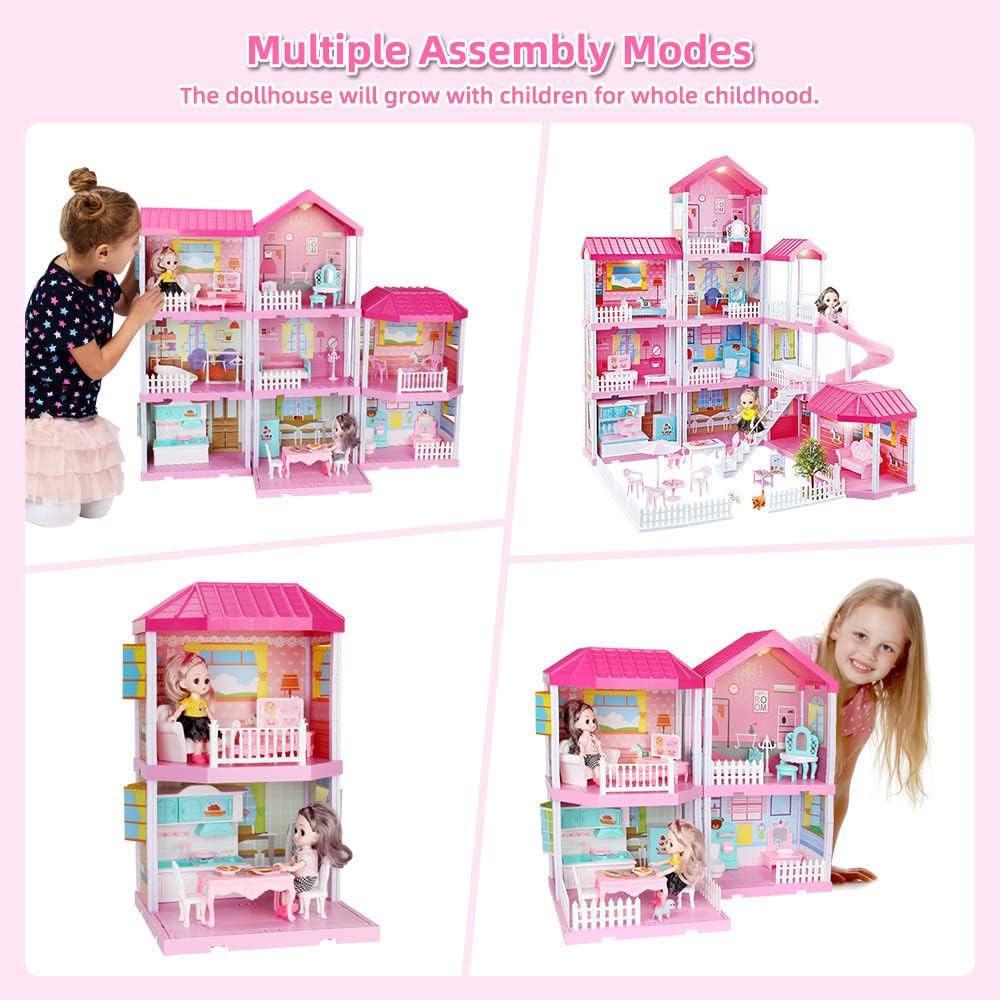 Doll House Kit.Dollhouse with Lights. Slide. Pets and Dolls. DIY Pretend Play Building Playset Toys with Asseccories and Furniture. Princess House for Toddlers. Kids Boy & Girl (11 Rooms)