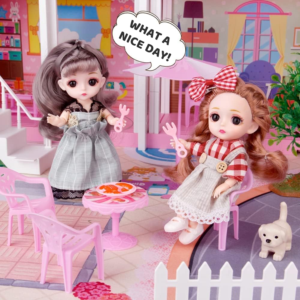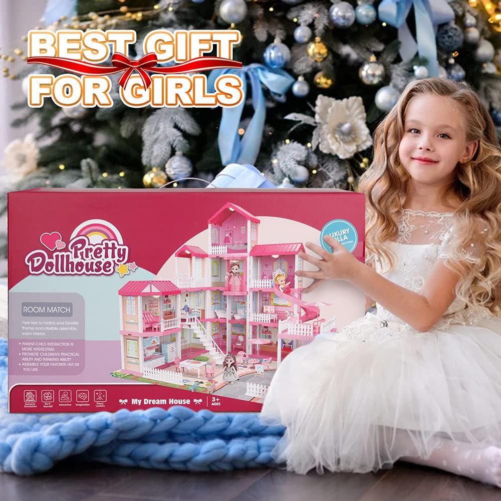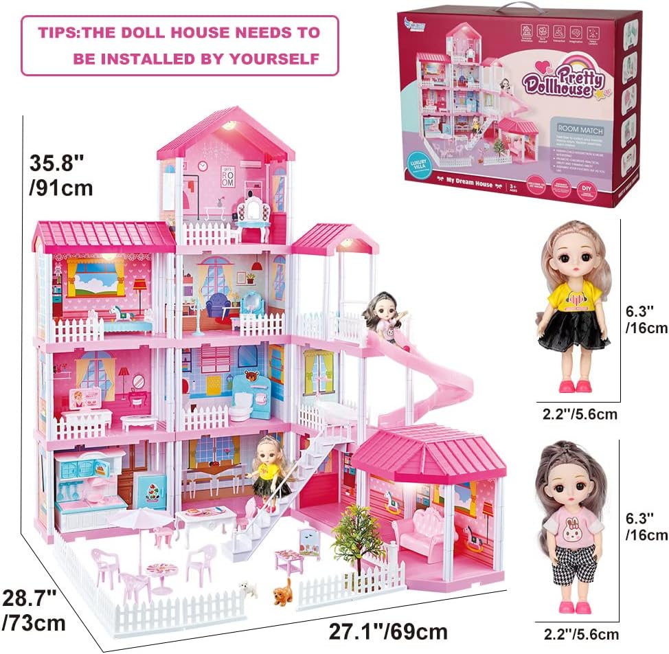 Dreamy Dollhouse Playset with Elevator.Slide.Stairway.Lights.Furniture.Accessories.Pretend Play Dreamhouse with 3 Dolls& 2 Pets.Best DIY Doll House for 3 4 5 6 7 8 Year Old Kids Girls (13 Rooms)