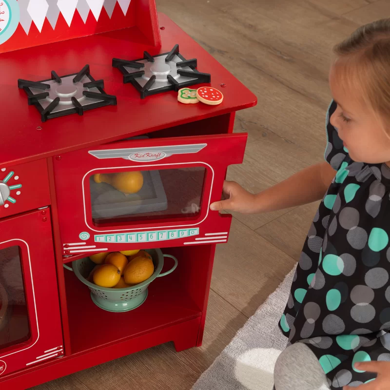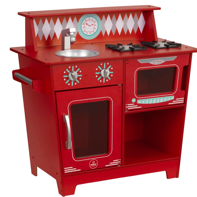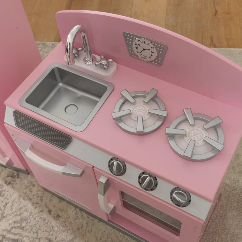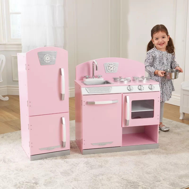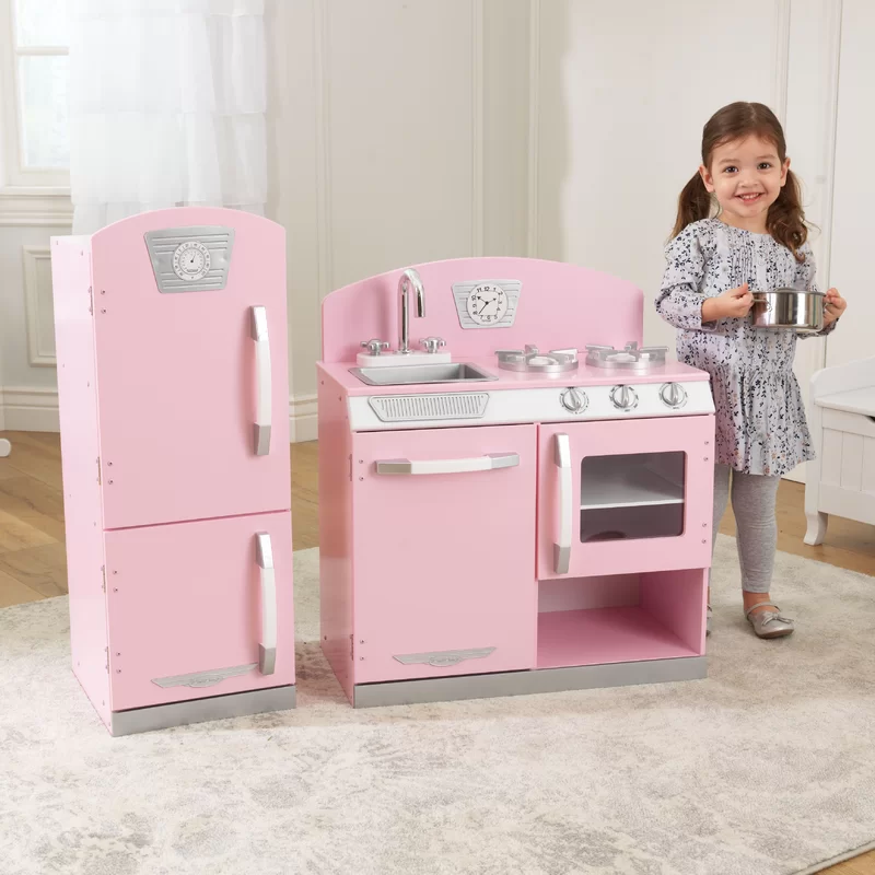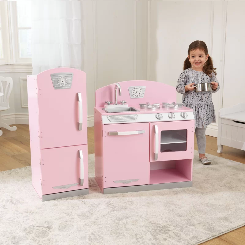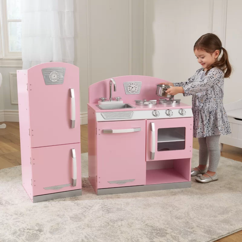 KidKraft Retro Wooden Play Kitchen and Refrigerator 2-Piece Set with Faucet. Sink. Burners and Working Knobs. Pink. Gift for Ages 3+