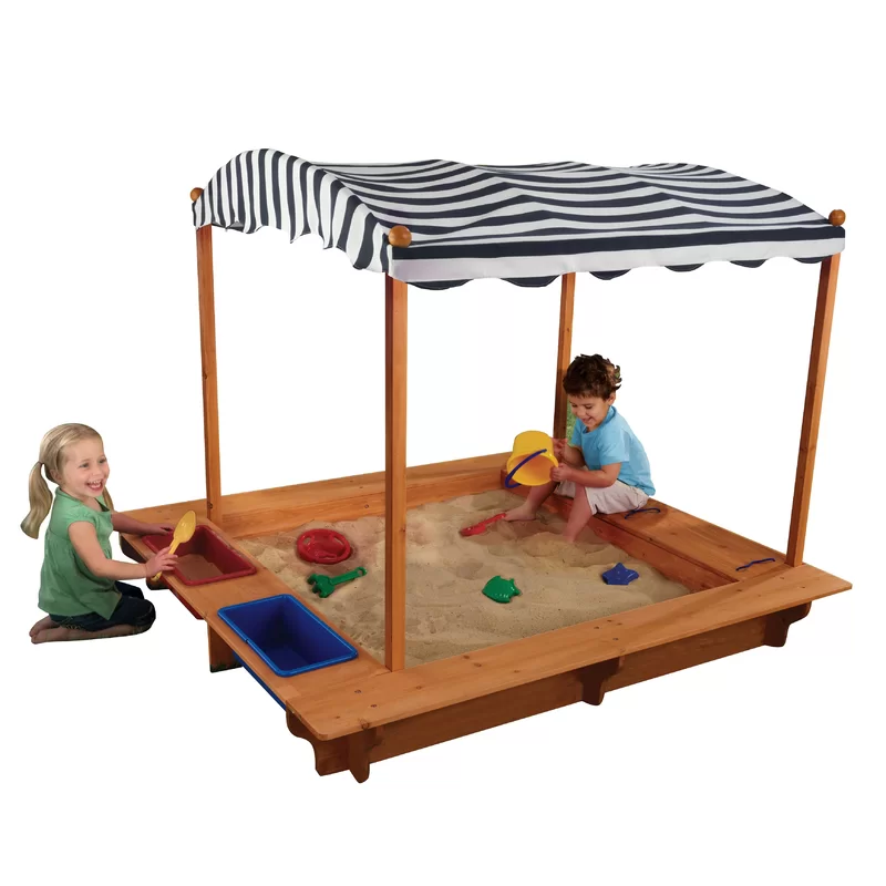 KidKraft Outdoor Covered Wooden Sandbox with Bins and Striped Canvas Canopy. Kids- Outdoor Furniture. Navy & White. Gift for Ages 2-8