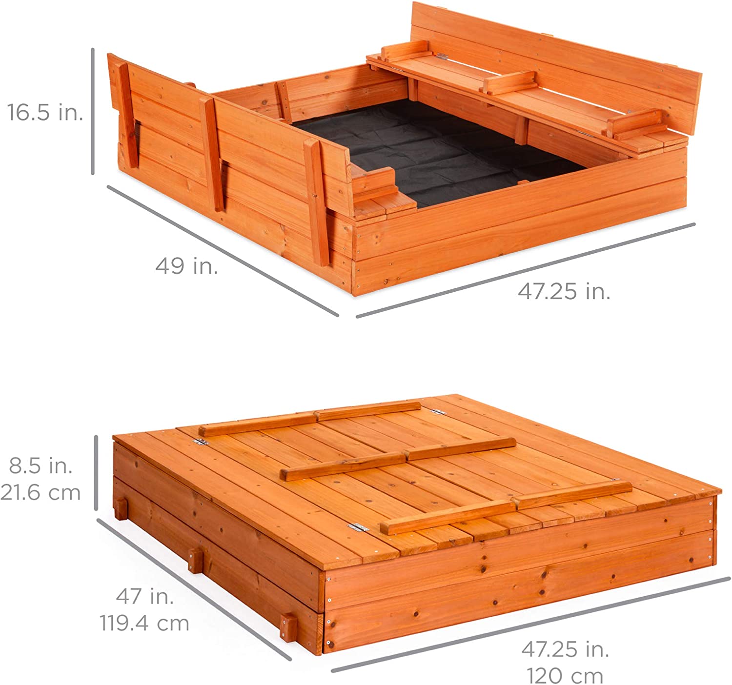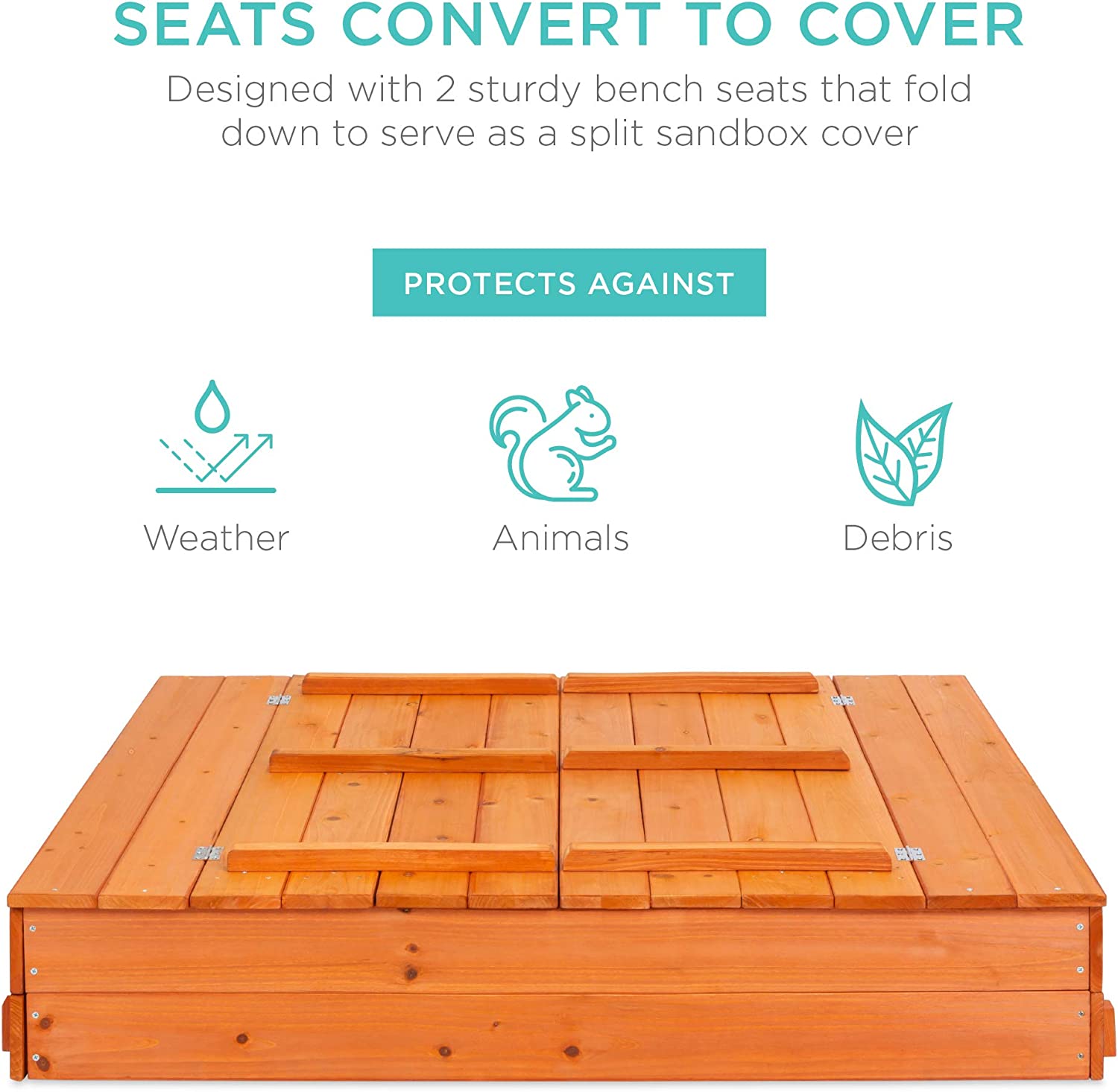 Best Choice Products 47x47in Kids Large Wooden Sandbox for Backyard. Outdoor Play w/Cedar Wood. 2 Foldable Bench Seats. Sand Protection. Bottom Liner - Brown