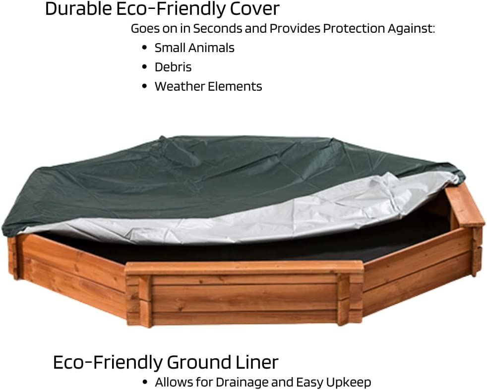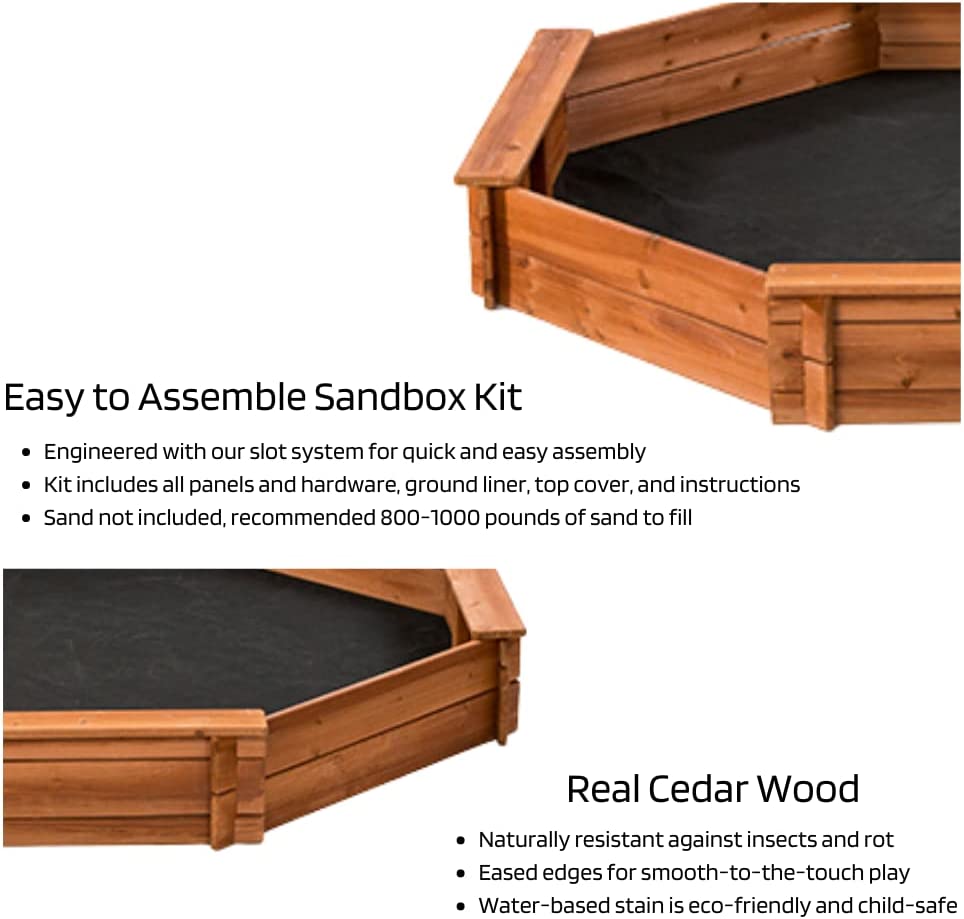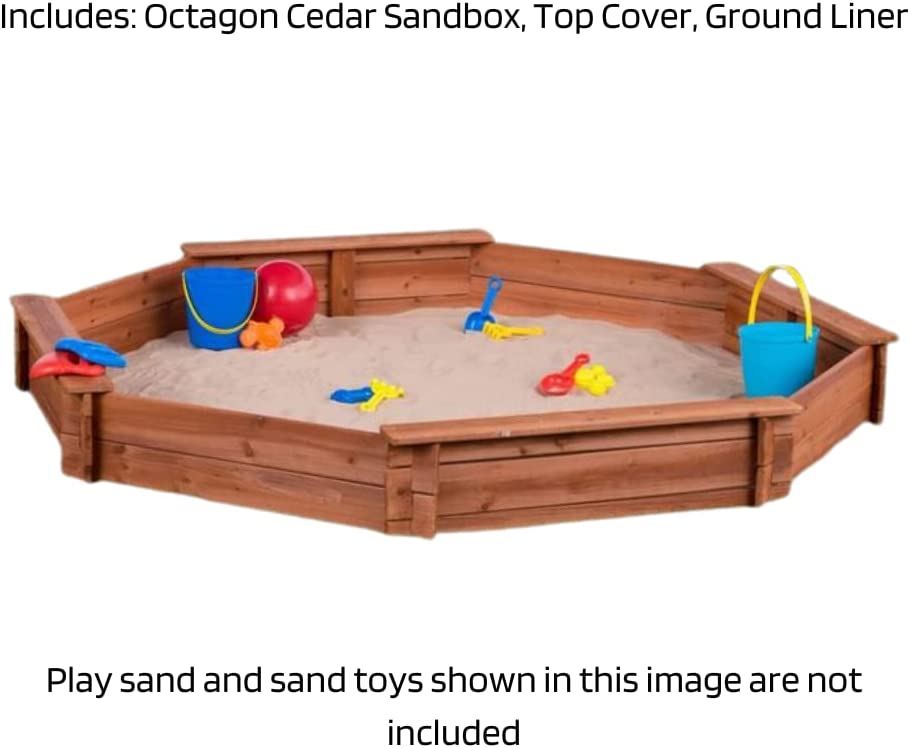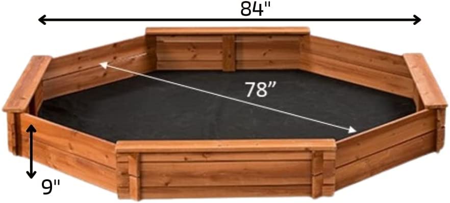 CREATIVE CEDAR DESIGNS Octagon Wooden Cedar Sand box w Seat Boards | Eco-Friendly Cover & Ground Liner | 84″ X 78″ x 9″ | 3/4″ Cedar Boards | Easy DIY Assembly | Holds 800+ lbs of Sand | Natural Cedar Beauty Built To Last